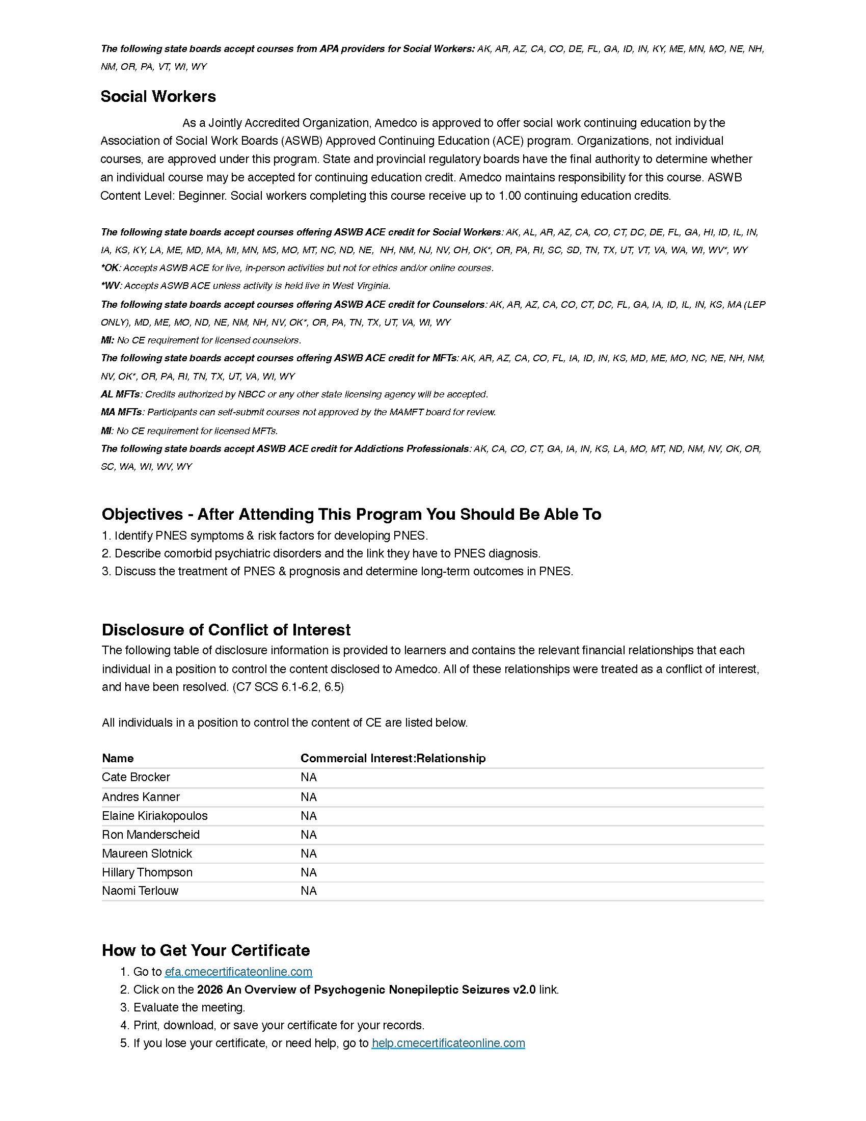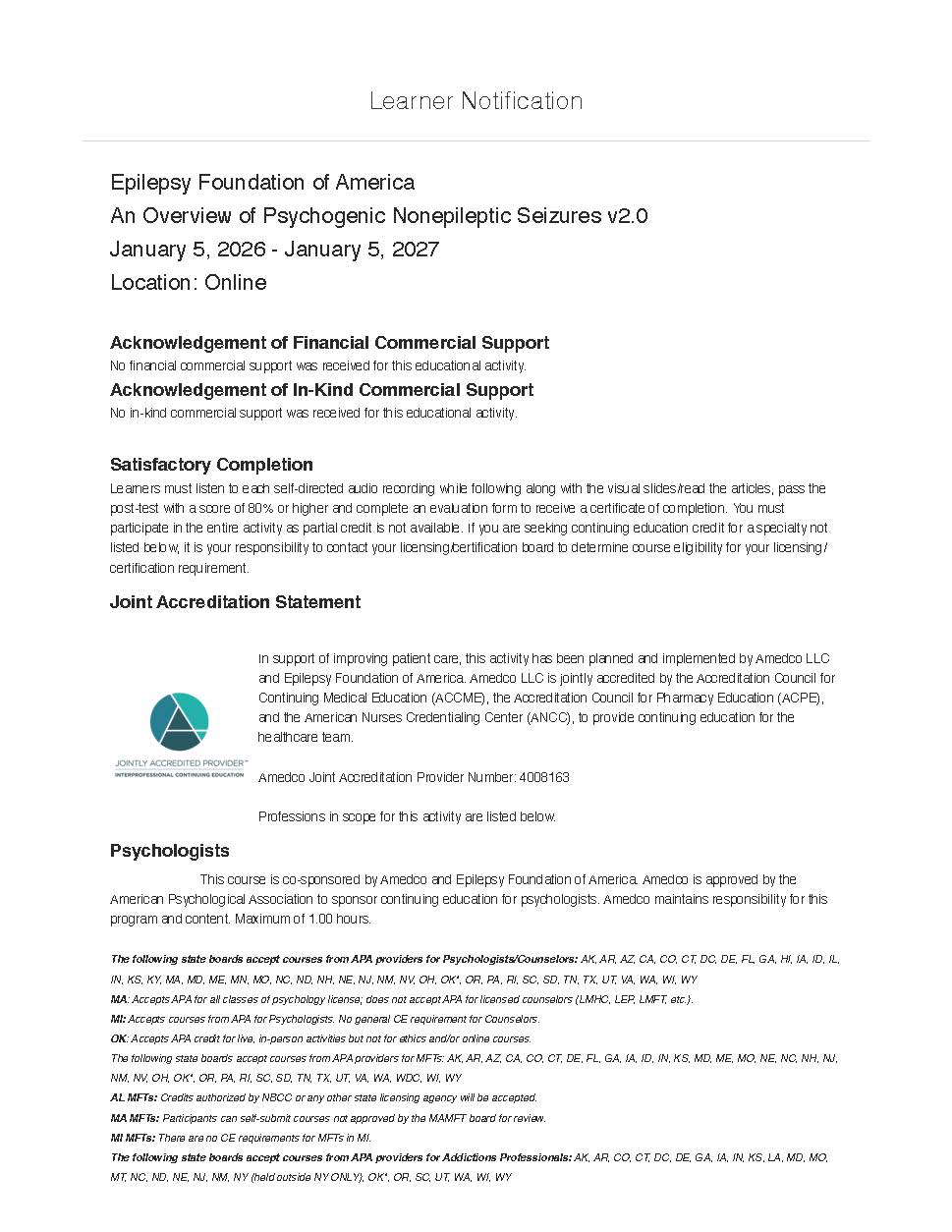 Yes. This course offers jointly accredited continuing education for multiple healthcare and behavioral health professions. The activity is jointly provided by the Epilepsy Foundation of America and Amedco LLC, a Jointly Accredited Provider recognized by: